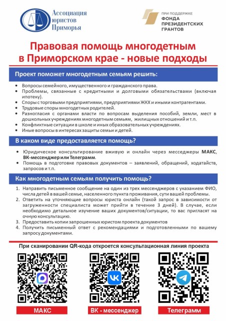 ОО «Ассоциация юристов Приморья» при поддержке Фонда президентских грантов запускает проект — «Правовая помощь многодетным в Приморском крае — новые подходы»